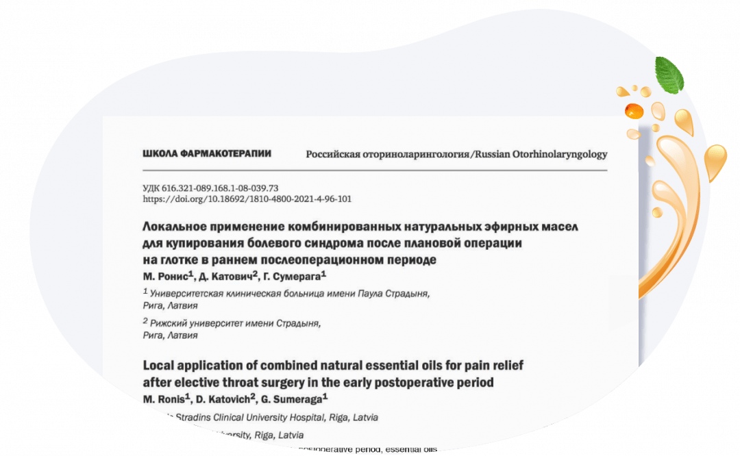 Локальное применение комбинированных натуральных эфирных масел для купирования болевого синдрома после плановой операции на глотке в раннем послеоперационном периоде